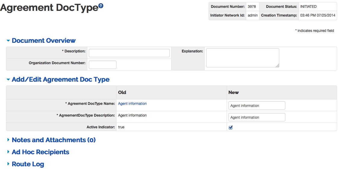 The Agreement Document Type document includes the Add/Edit Agreement Doc Type tab. The system automatically enters data into both the Old and New sections. Selected data fields are available for editing.