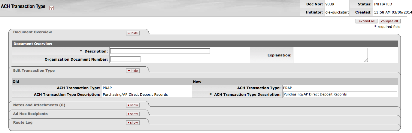 Only users with the OLE-SYS Operations role may create ACH Transaction Type documents. These documents do not route for approval.