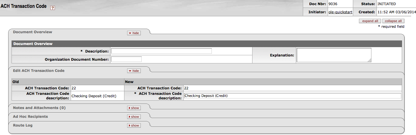 Only users with the OLE-SYS Operations role may create ACH Transaction Code documents. These documents do not route for approval.