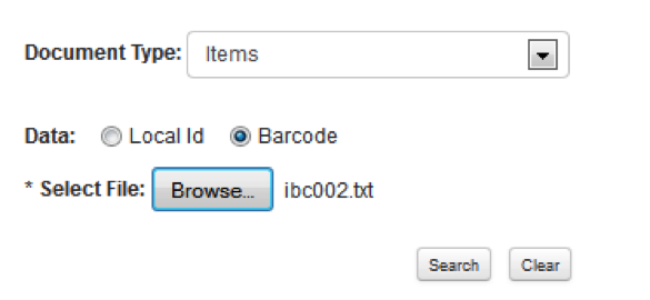 Identify the file that contains the list of local identifiers or barcodes, by clicking on the Browse button (or Choose File depending on your browser) next to “Select File.” Highlight the file to be imported in the browse window and click Open.