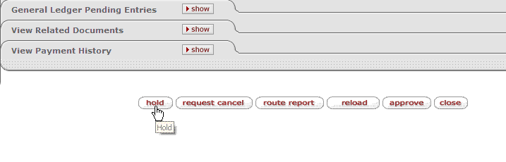 The hold flag prevents a payment request from being extracted and paid. A payment request may be put on hold any time between submit and the time it is extracted to the Pre-Disbursement Processor. When a document is taken off hold, it retains the status it had when the hold flag was turned on.
